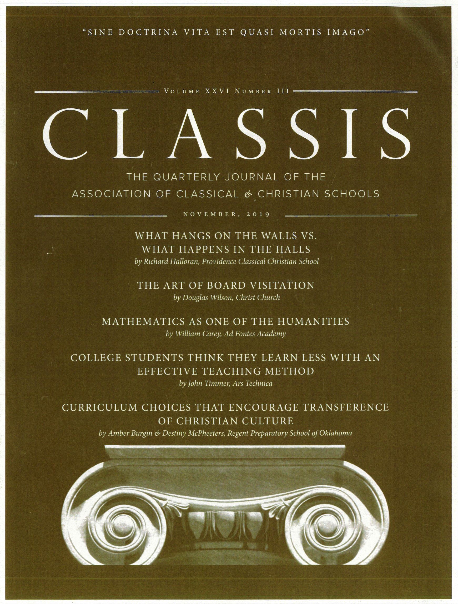 The following article appeared in the Classis: The Quarterly Journal of the Association of Classical & Christian Schools, Volume 26, November 2019. Published quarterly, this journal is for educators and thinkers who want to delve into the details and understand classical Christian education on a deeper level.